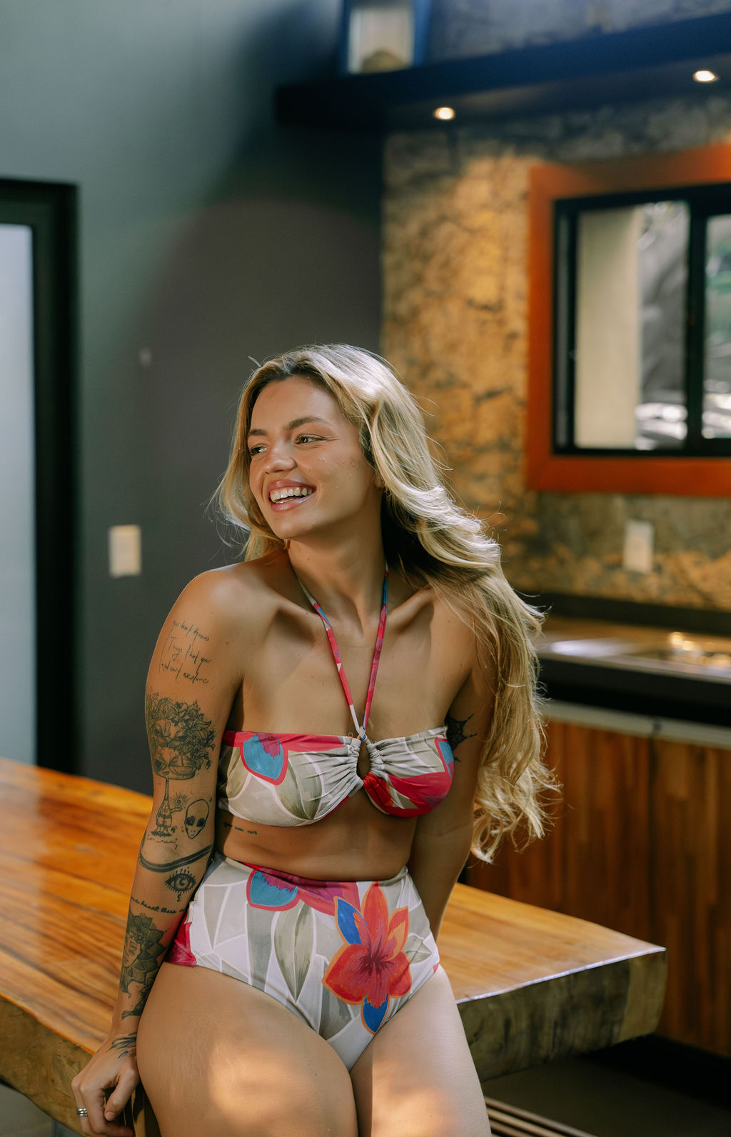 Sinônimo de elegância, o top MIKONOS possui busto tomara-que-caia (com bojo), cortininha na junção dos bustos, e amarração no pescoço!